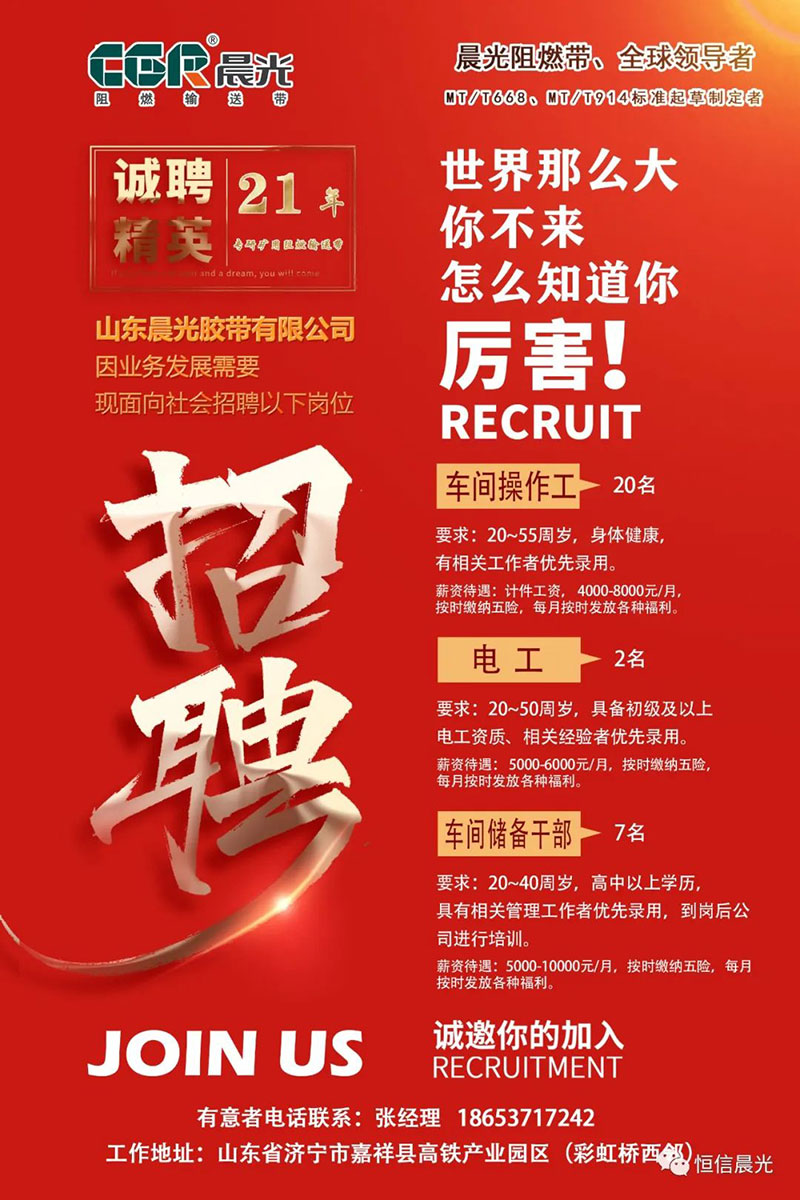 山東晨光膠帶有限公司開始招聘啦!公司成立于2003年,位于嘉祥縣萬張鎮(zhèn)高鐵產(chǎn)業(yè)園,專研阻燃輸送帶21年,公司擁有一支高素質(zhì)的員工隊(duì)伍,連續(xù)多年被評(píng)為國(guó)家級(jí)高新技術(shù)企業(yè),省級(jí)企業(yè)技術(shù)中心。 ?